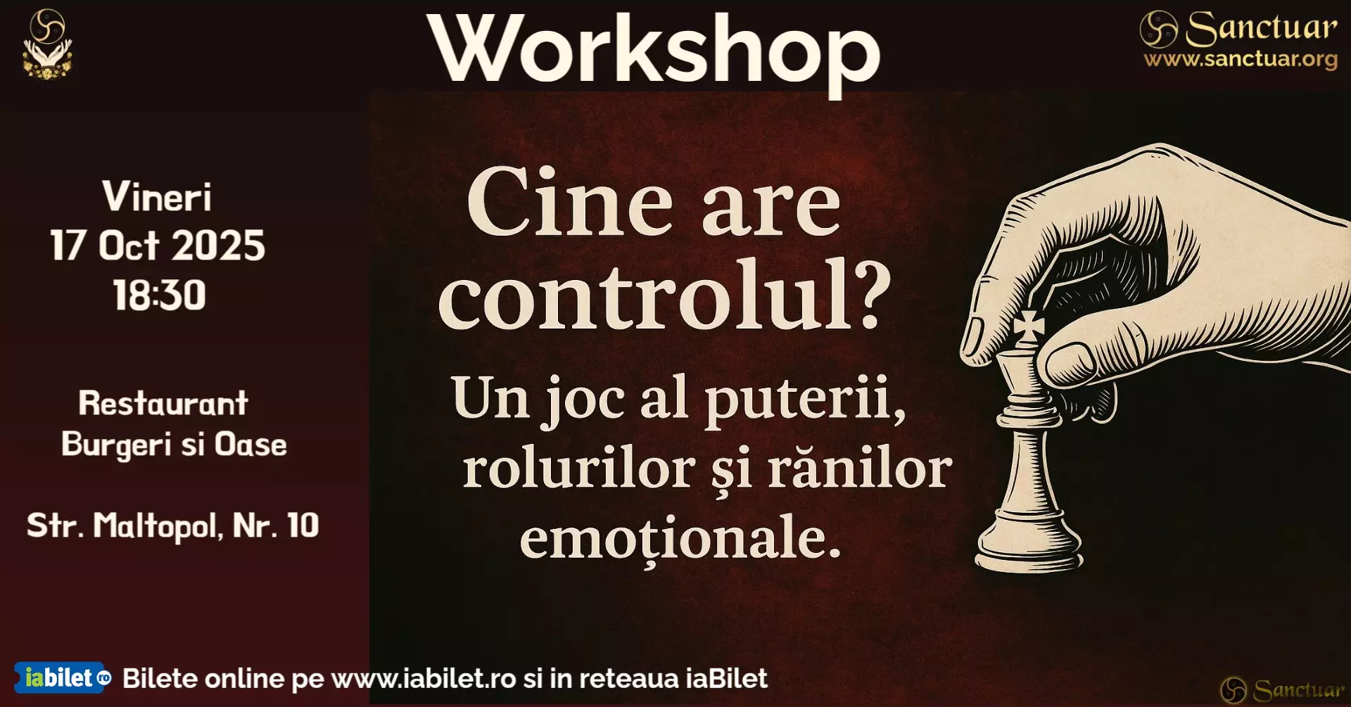 Un workshop interactiv despre putere, roluri și vulnerabilitate. Prin jocuri de rol și întrebări ghidate, explorăm cele 5 răni emoționale (abandon, trădare, nedreptate, umilire, respingere) și modul în care ele se oglindesc în dinamici kinky și relaționale.Participanții vor experimenta:
